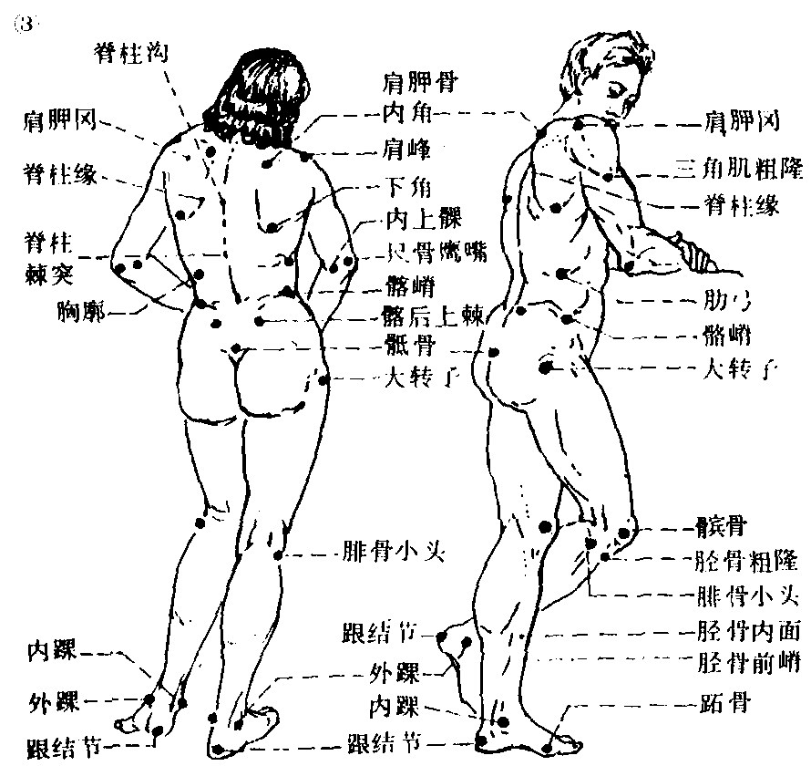 人体外形骨露点Renti waixing guloudian人体骨胳显露于外形的骨形。是确定结构、形状、测量比例的标志点,在关节处和重要转折处的骨点在绘画上称为不动点图3 |