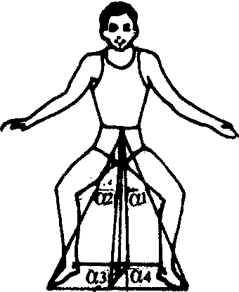 稳定角(α1、α2、α3α4分别为左、右、前、后稳定角) 静平衡动作可分为静态平衡动作和动态平衡动作。前者,指的是一些静止动作姿势(如手倒立、吊环十字支撑等),人体须保持不动的姿势和固定的位置;后者,为人体在运动中所作的平衡动作(如花样滑冰的燕式平衡等),人人体在空间的位置并不固定,但须保持不动的姿势。做平衡运动时,根据人体重心与支点位置关系一般分为上支撑平衡(支点在重心上方,如各种悬重动作)和下支撑平衡(支点在重心下方,如手倒立、鞍马分腿骑撑)。评定体育运动中人体静平衡动作常采用稳定角(重力作用线和重心到支撑面边界上任意边界点的连线之间的夹角)。对于起动性静力性动作,如起跑,在起动方向上要求最小的稳定角;而摔跤,要建立较大的稳定角,使身体在此方向上保持较大的稳定性。评定体育动作,分析技术或纠正错误动作,以至研究某些人体运动规律时,都离不开分析人体重心的位置及其变化。因此,人体重心及其测定是人体静力学范畴里重要课题之一(见“人体重心”)。 人体静力学Renti jinglixue研究人体从事体育活动的平衡问题,分析人体处于平衡状态时所受各作用力之间的关系。静平衡动作的力学条件是:❶重心位置不改变,重力作用线通过支撑面。 人体静力学运动生物力学组成部分。研究人体运动时人体内力、外力保持平衡问题。 |