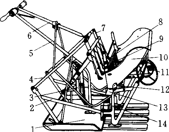 人力梳式插秧机 1.船板 2.机架 3 .摇杆滑道机构 4 .摇臂 5.牵引架 6.操作杆 7.秧爪架 8. 秧爪 9.秧帘 10.秧箱 11.移箱机构 12 .纵向送秧机构 13 .秧门板 14.深浅调节片 |