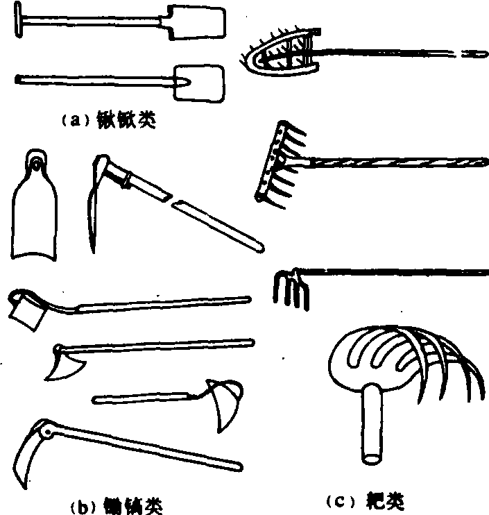 人力耕作工具 锹锨类 用于北方旱田翻地、铲土、筑畦、挖沟等。古时名为锸、杴、钱、铫的手工具以及现在各地的锹、锨、铲、鋧(无锡)均属此类。锹由锹头和木柄组成。锹头采用优质钢板制造,锹板形状为长方形,刃口多为直线。锨的结构与锹相似,但锨头均为长方形,且较宽大,刃口平直。有的锨板呈桃形,刃口为曲线,尖部锋锐,利于插入土中。锹和锨的柄均为木制,锹的末端有横木如拐[图(a)]。 锄镐类 用于南方翻地、挖土、掘根茬、开沟、挖坑、中耕除草、挖取薯类等。这类手工具南方统称锄,北方多称镐。新疆农村则称为“砍土镘”(维吾尔语意即“刨地用的工具”)。古时的镬亦属此类。其基本构造完全相同。均系由手柄与镐头(锄板)构成,锄板与柄约成70°~80°的夹角[图(b)]。柄为木制,长约1~1.3米。 鹤嘴锄称泽镐。柄较短,铁嘴一端为凿形,一端为锥形。有很强的破土能力。一般用于掘松硬地,挖取石块,开深沟等。 轻型的锄用于人力中耕除草。大的为板锄,小的为耨锄。锄板有长方形、扇形、空心三角形、半月形等。用于中耕的拉锄,锄板与锄柄之间的夹角较小,约40°~ 50°。锄柄下端向上弯成弓形以利于脱草。 齿耙类 包括齿耙、钉耙、齿镐、铁扒[图(c)]等。古代的铁搭、铁耙亦属此类。耙齿较少(2~4个)且较粗壮者为齿镐,用以松掘硬地及疏捣积肥。耙齿较多,排列较密且细长者为钉耙,用于耙碎耕翻后的地面土块,整平地表,北方平整采畦多用此工具。此外,稻田用的蟹爪、耘车、稻荡等带齿爪的手工具,可以扒烂泥土,挖出草根,促进稻秧生长。 |