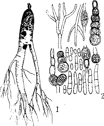1.被害参根 2.病原菌的分生孢子梗、分生孢子和厚垣孢子