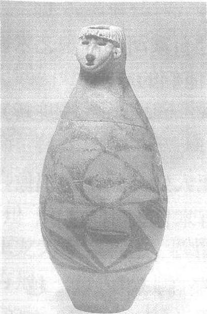 人头形器口彩陶瓶 这件彩陶瓶,构思奇巧,器口是以圆雕形式做成的人头像。披发梳理整齐,额头“刘海儿”齐眉。五官清秀,双目深邃,鼻翼微鼓,樱口欲张,耳垂扎有穿孔,以系饰物。器身造型典雅,与人物形象浑然 一体,以黑彩绘出的弧线三角纹和斜线纹,疏密得体,在红色衬地上愈显得绚丽多彩,宛若 一姣小少女穿了一件漂亮的花衣。 模拟某些人物或动物形象,并使其成为器物整体或局部的有机构成的造型方法,是我国原始时代艺术家在长期实践中的重大创造。这种方法较多地运用于制陶领域,并对后世青铜工艺产生重大影响。 |