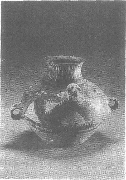| 释义 | 人头饰彩陶壶新石器时代马家窑文化。通高16.5厘米,口径8.3厘米。1971年青海省民和县出土。青海省文物考古研究所藏。此壶口外侈,短颈,斜肩,鼓腹,平底。腹部对称处有一对环形耳,腹部以上绘黑彩纹饰。颈部有竖条纹,肩腹部为折线锯齿纹。肩部塑一人头,面部绘黑彩。这种绘塑结合的陶器在青海、甘肃彩陶中多有发现。马家窑文化见“束腰彩陶罐”条目。
