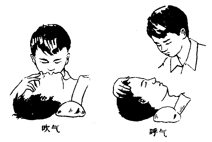 人工呼吸的关键是保持呼吸道的通畅, 故在施行人工呼吸前,应先解开病人的领口,紧身的衣服和裤带,清除口腔的异物、血块和呕吐物。对溺水者不应过分强调倒水,以免延误急救时间。口对口人工呼吸时,开始吹气的压力和气量要大些,10—20次后再逐渐减小。采用压胸或压背法人工呼吸时不要用力过猛,以防引起肋骨骨折。上述三种方法以口对口呼吸法最为有效。 人工呼吸法是运用人工操作的手法,使失去自主呼吸的病人能继续维持肺脏的呼吸功能。进行人工呼吸前要清除口鼻的异物,除去活动假牙,解除紧束颈胸部的衣服,保持呼吸道通畅。必要时用钳拉出后坠阻碍呼吸道的舌头。口对口吹气法快速简便易行,方法是病人平卧头向后仰,操作者托起其下颌使之张口,在口上盖一块纱布或手帕,一手捏紧病人的鼻孔,深吸一口气对着病人口部吹入,看到病人胸廓隆起时,停止吹气同时放开捏紧的鼻孔,使其胸廓复原。如此反复进行每分钟16~18次(图2—2—19)。俯卧压背法是病人俯卧头偏向一侧,胸腹部贴地,双臂伸过头一臂枕于头下,另一臂向外伸展,以使胸部扩张。操作者面向病人头部,两膝跨跪在病人的大腿两边,双手平放在病人肩胛骨下脊柱两旁,手指并拢,慢慢用力向下向前压,当操作者肩膀与病人呈垂直状态时,便停止用力压形成呼气,然后松手抬身使外界空气进入肺内形成吸气。如此有节律的反复进行(图2—2—20)此法多用于溺水病人的抢救,不适于孕妇。仰卧压胸法是病人仰卧头偏向一侧,操作者面对病人两膝跨跪在病人的大腿两旁,两臂伸直双手放在肋缘下向下向前压,方法同上。压力均匀适当不可用力过猛。