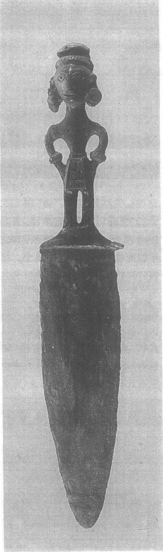 | 释义 | 人形柄铜匕首战国。匕首,近身刺杀的武器。通长20厘米,刃宽3.5厘米,柄长8.6厘米。1974年湖南省长沙市树木岭出土。湖南省博物馆藏。此匕首之柄作立人形。大眼,高鼻梁,头上有圆饰形发髻,后垂长辫至肩部,耳上有粗大的耳坠;两手叉于臀部,手指伸开,袖子在手腕处打结;胸部露出乳房,腰间系短裙,上有尖角形和条形图案;两足并立,脚趾分开。从形象看当属于古代南方的少数民族。发型服饰都值得研究,是一件珍贵的艺术品。