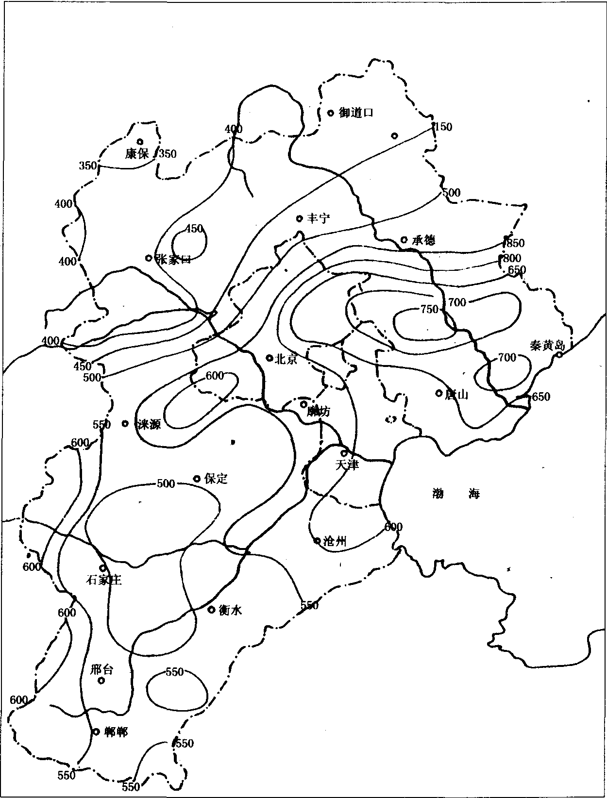 图1-2-2 河北省年降水量分布图 (毫米) 河北省年降水相对变率在全国是属于高变率区之一。全省各地除冀北山地低于20%之外,其余大部分地区均为20%~30%,其中以冀中平原的新城—固安一带,定州—保定一带和冀南平原的沙河最高,达30%~33%。 各月降水相对变率都比年降水相对变率大,大部分地区以冬季 (12、1月)最大,夏季 (7、8月)最小。1月降水相对变率除东部沿海及冀西北地区小于100%外,其他大部分地区为100%~130%; 4月降水相对变率各地为53%~97%,尤以太行山东部迎风坡地带为最大 (80%~97%); 7月降水相对变率各地在23%~60%之间,以太行山东部的冀南平原为最大(45%~60%); 10月降水相对变率各地为49%~88%,以保定—廊坊一带为最大,达80%~88%。 河北省各地最多年降水量,除冀北山地及冀北高原为500~800毫米外,其他大部分地区如燕山东部迎风坡地带的唐山、秦皇岛地区,太行山迎风坡地带及冀南平原和沧州沿海等地区,多为1 000~1 200毫米。太行山南部迎风坡发生过特大洪涝 ( “63.8”),暴雨中心高达1 400~1 758毫米,为全省最多区; 冀西北地区的冀北高原及桑洋盆地不足600毫米,为全省最少区。而冀中平原的少雨区衡水—新乐一带,保定—廊坊一带亦不足1000毫米。 最少年降水量除康保、宁晋及桑洋盆地的阳原—怀来一带不足200毫米外,其他大部分地区多在200~459毫米。燕山东部的承德、秦皇岛、唐山大部分地区及紫荆关、文安、盐山、涉县、曲周等地在300毫米以上,其中燕南山地迎风坡地带的兴隆、遵化、迁西、青龙等地在400毫米以上,为全省最多区。 各地最多年降水量与最少年降水量之比值,其分布特征基本上是由北向南递增。冀北山地较小,在1.8~3.0之间,其中鱼儿山仅为1.8,为全省最小;其他大部分地区多在3.0~7.1,其中保定地区多在4.0以上,太行山南部迎风坡多在5.0以上,为全省最大区,邯郸1963年降水量为1 572毫米,1986年只有220毫米,两者之比达7.1倍,为全省最大 (表1-2-1)。 表1-2-1 各地最多、最少年降水量及其比值 单位: 毫米