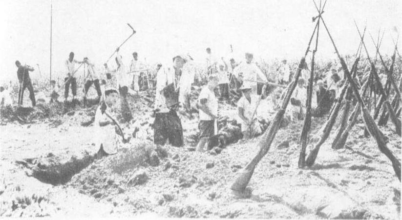 河北省人民公社社员在深翻土地利用生产空隙时间练兵 人民公社化运动“大跃进”全靠劳动力的大量投入和劳动强度的提高,大跃进的发展,使劳动力不足的矛盾更为突出。在当时导致了进一步变革生产关系以解放生产力的结论。于是规模巨大的人民公社化便“应运而生”。中央北戴河会议后,一个人民公社化运动的高潮在全国各地兴起。湖南8月下旬开始搞建社试点,在不到一个月时间内即建立农村人民公社1112个,入社农户占全省农户总数的99%以上,宣告全省实现人民公社化。人民公社的特点是“一大二公”。所谓“大”一是规模比农业合作社大,湖南平均每个公社达7470户,其中最大的公社多达2.8万户,11.4万人; 二是经营范围比合作社大,它不仅是农业生产组织,而且是农林牧副渔各业俱全、工农商学兵五位一体的社会基层组织。所谓“公”,一是把农村基层政权组织和经济组织合而为一,把农村中原属全民所有制的一些企业下放给公社管理,使人民公社集体所有制经济中,增加若干全民所有制的成份; 二是把社员的自留地、家禽家畜、家庭副业收归社有,消除“生产资料私有制的残余”; 三是实行组织军事化、行动战斗化、生活集体化,大搞公共食堂、幼儿园、托儿所、幸福院等公共事业,实行工资制和粮食供给制相结合的分配制度,大力推广吃饭不要钱,试行把全部或大部分人民生活包下来的供给制。当时,湖南全省办起了公共食堂35.8万个,托儿所、幼儿园35.5万个,敬老院8162个。人民公社终因脱离客观实际,党的十一届三中全会后,被全部撤销,改为乡村体制。 |