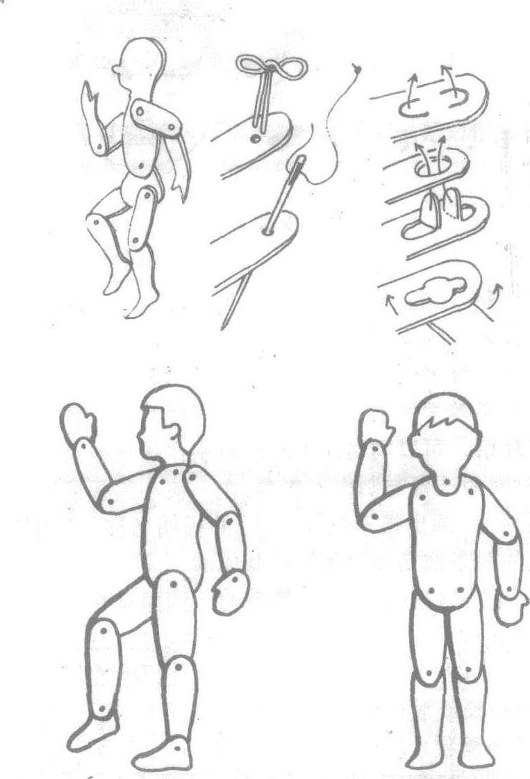 | 释义 | 人物动态教具Renwu dongtai jiaoju用于人物画教学,可摆出某些动态的模型。在美术教学中,画出不同的人物动态是小学生难以掌握的。教师动手制作人体动态教具来辅助教学,可以取得良好的教学效果。这种教具突出人体的关节部位,使学生便于掌握不同动作的人物。这种教具有两种。一种是用卡纸制作的(如图1),分为正面和侧面两个活动人形。由头、躯干、四肢三大部分组成,颈、肩、肘、髋、膝关节是由分解的部分重叠结合起来用金属丝弯成8字钉,在轴两侧加垫片,既固定又能活动。恰当地使用这个教具对低中年级学生非常有用,效果很好。有条件的教师还可以印出图纸,让每个学生各做一套,在创作课上应用,另一种是人形活动教具,采用空心的竹、木制成的。可以全方位转动使用 (如图2),由头、颈、躯干、骨盆和四肢几部分组成。按一定长短比例,截断材料,在关节部位加上一粒珠形结构,空心中贯穿一根金属丝,这样就可以模拟人体的多种动作。这种教具对高年级学生的创作课教学很有用处。香椿木嫩枝或多年生灌木都有组织疏松的髓,可以便于穿孔和制作。