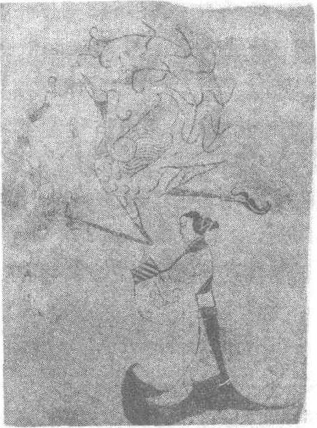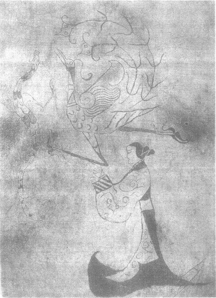 人物龙凤帛画 人物龙凤帛画以毛笔画于丝织的帛上,平涂施色。1949年出土于湖南长沙陈家大山楚墓。帛画高28厘米,宽20厘米。模写的是一位女子的形象。人像绘于画面下部稍偏右处; 她的发髻梳于脑后,拱手胸前,博袖束腰,长裙曳地,衣裙上绘出模拟丝织品的纹饰。头部勾画清晰,细眉明目,直视前方,姿态虔诚。人像以上留出画幅近2/5的面积绘出 一巨大的凤鸟,昂首展翅,华尾向上卷扬,双爪前后迈开作奔跑状。又在人像和凤鸟的左侧绘一向上浮动的游龙,体形较小而细长; 身躯作“S”形扭摆,伸首升向天空,身姿矫健。寓意为龙凤导引死者灵魂升仙。