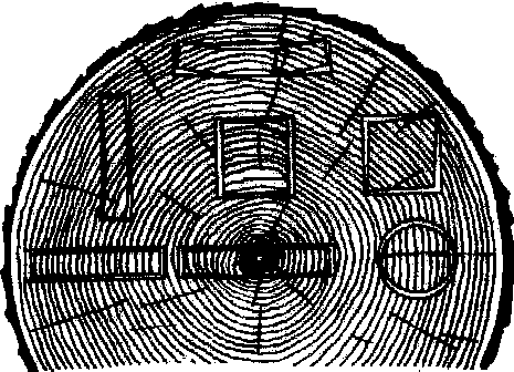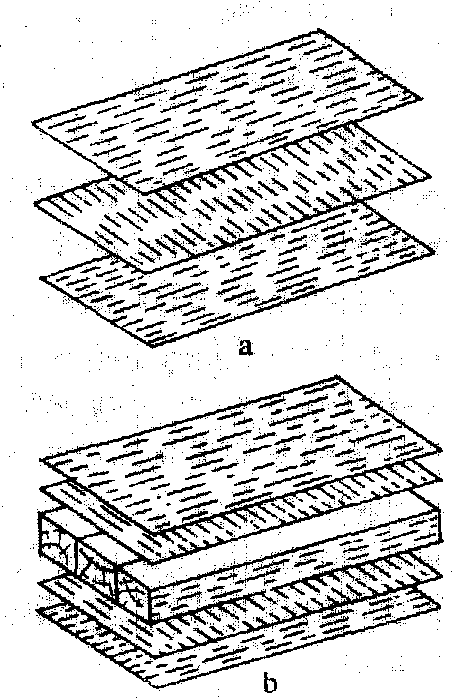图1 木材不同部位的板材干缩后的变形 胶合板因其组成为木纹相互垂直的三层以上成单数单板粘合而成(图2a),很大程度平衡了木材长度方向与径、弦向之间的性能差异。种种天然缺陷也随之去除,而且板面平整、幅面扩大,利用方便。特别是在力学性能方面,抗剪强度有很大提高,这就赋予胶合板作为构件的蒙皮材料时的独特优良性能。做外墙蒙皮时,9.5毫米厚的胶合板足可代替25.4毫米厚的木板。由于胶合板不容易开裂,握钉力大,在做包装箱时,6.4毫米厚的胶合板可代替19毫米厚的木板加以使用。做木材地板时,鉴于使用时经常需要承受冲击力,不得不使用板条加以拼镶;胶合板由于其抗冲击力强,其宽度一直可以扩大到1 220毫米,给施上带来很大方便。当木材用于木结构时,由于其天然缺陷、生物变异,长期载荷所带来的种种问题,结构设计所采用的安全系数要比胶合板大得多。