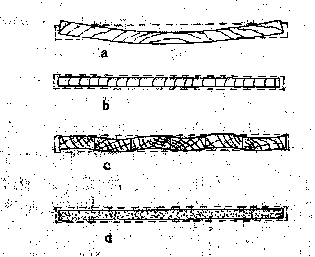 图2 三层胶合板及五层细木工 当木板干缩之后,会发生变形、翘曲(图1,图3a、b),如将木板锯开再行拼接,则其翘曲可以显著改善(图3c)。因此,细木工板(图2b)的尺寸稳定性优于实体木材。纤维板及刨花板均系由较小的“单元”材料所组成,翘曲变形量也即随之减小(图3d)。