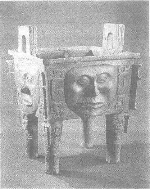 人面纹青铜方鼎,又称大禾人面方鼎,因内壁铸有 “大禾” 铭文而得其名。通高38.5厘米 ,口长29.8厘米。1959年湖南省宁乡出土,为商代后期遗物。商代青铜工艺雕塑题材多为动物,人物不多,有圆雕,也有浮雕,以人面纹作为器物主题装饰的浮雕仅见此例,故弥足珍贵。此器为四足方鼎,立耳,深腹,十分稳重、庄严。器腹四壁饰相同的人面像。脸形扁圆,高颧骨,大耳朵,蒜头鼻,宽嘴巴,表情肃穆。可以看出,商代匠师对人物形象有较高的概括力和表现力。对于人物的内涵,有的学者认为,四面人像与黄帝四面传说有关。有的学者认为,青铜方鼎上的四面像,倒不一定和黄帝有直接联系,但可能与商人的祭祖活动——禘祭有关。古人在祭天地的同时,也祭祀自己的祖先。青铜方鼎作为礼器,上面的人像可能是祭祀者祖灵的形象。