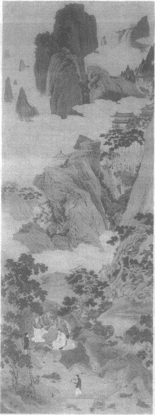 | 释义 | 仇英桃源仙境图轴明。仇英(见《仇英停琴听阮图轴》条目)绘。绢本设色。纵175厘米,横66.7厘米。天津市艺术博物馆藏。此图描绘一幅“世外桃源”的仙境。纵览全图,上部远处是白云环抱的座座高山,山势陡峭,高耸云天。山上苍松翠柏,古藤缠绕,飞瀑高挂,座座亭台楼阁仿佛在山雾间,又仿佛是矗立于云海中,虚幻缥缈。近处的山坡上,桃花盛开,交互掩映,使作品增添了理想化的色彩。三位似仙的雅士身穿白衣坐在山洞旁的小溪边,一位仿佛在弹琴,一位正舞动手臂,第三位雅士静坐中间低首聆听,还有两位童子在侍奉着。此图意境幽雅,笔墨流畅,精工艳逸。笔法秀润谨细,骨力峭劲。设色鲜丽,气韵生动。人物用笔也精细,须眉毕现。此图是仇英青绿金碧山水的杰作,充分体现了他在工笔重彩山水画方面极深的造诣。此图曾为清人安岐收藏,后入清宫。《墨缘汇观》著录。