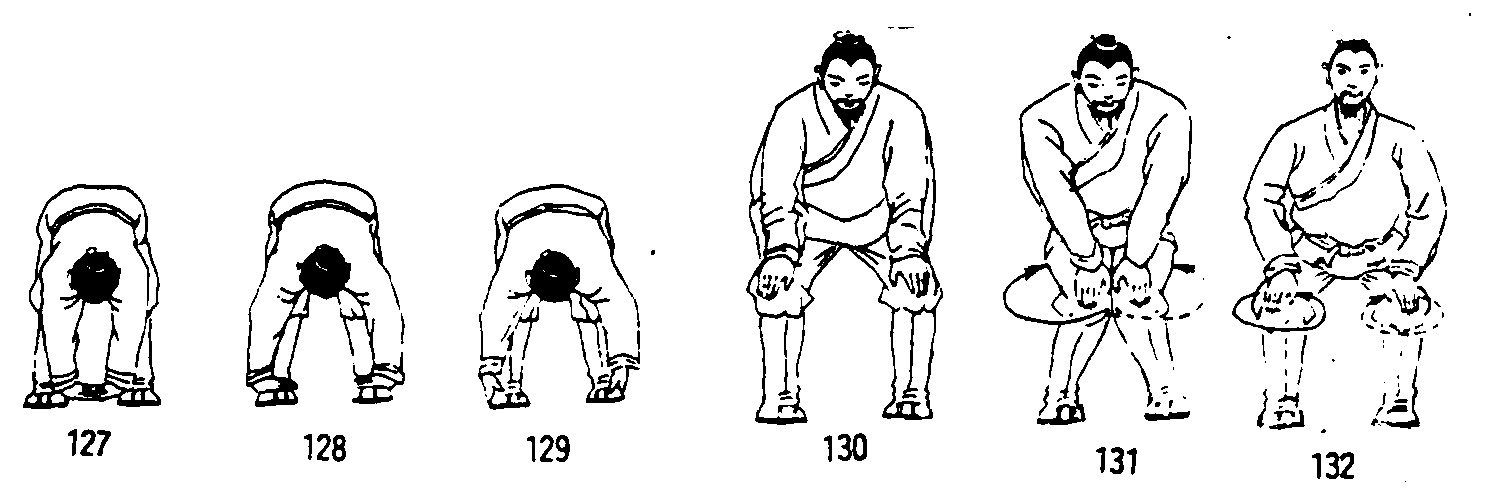 四十九式经络动功第3段“导气”动作之七(全套动作顺序第二十九式):❶两掌仍触地不动,臀部提起,两腿伸直成躬身吊尾势。(图127)❷两掌分开分别经脚面、昆仑向上摩运至委中后移到鹤顶穴上,上体稍抬起;眼看前下方。(图128、129、130)❸两掌心按住鹤顶穴做由内向外的揉膝3周,两膝内侧要相靠;眼向前看。(图131)❹两掌心按住鹤顶穴做由外向内的揉膝3周;眼向前看。(图132)要点:揉膝时速度要均匀缓慢,幅度宜大;意守鹤顶;呼吸自然;脚跟不能拔起。