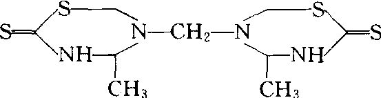| 释义 | 代森环milneb有机硫杀菌剂。化学名称:乙撑双(四氢-4、6-二甲基-1、3、5、2H-硫二氮苯-2-硫酮。化学结构式如下。白色结晶,不溶于水和乙醇,溶于硝基苯和硝基甲烷等。对光,热稳定,遇碱易分解,具可燃性,保护性杀菌剂,并具一定的残效。主要用于果树,蔬菜、大田作物防治猝倒病、立枯病、霜霉病、早疫病、炭疽病、锈病、黑星病等,既可作种子处理、叶面喷洒,亦可作土壤处理、窖藏处理。小鼠(♂)口服致死中量为14 200 mg/kg,对人、畜及鱼低毒。对植物安全,但使用期要避开花期,以免影响花粉发芽。