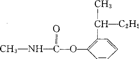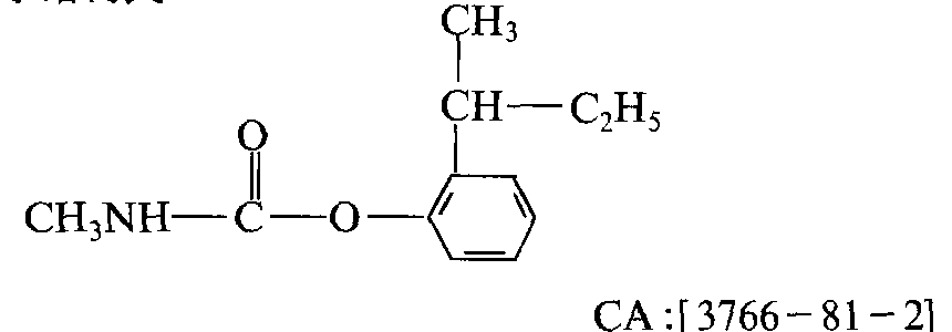 性能 纯品为无色结晶,熔点32℃,工业品熔点28.5~31℃,液态为淡蓝色或浅粉色,有芳香味。密度(d4 20)1 .050,沸点 112 ~113 ℃ ,25℃ 时蒸气压0 .533帕。20℃时在水中溶解度小于0.01克/升,丙酮中2000克/升,甲醇中1000克/升,苯中1000克/升。在碱性和强酸介质中不稳定,在弱酸介质中稳定,受热易分解。对高等动物低毒,大鼠急性经口LD50为410~635毫克/千克,大鼠急性经皮LD50 > 5000毫克/千克,对皮肤和眼睛刺激性很小。在试验剂量范围内,对动物无致突变、致畸、致癌作用。两年喂养试验,大鼠无作用剂量为5毫克/(千克·天),狗为11~15毫克/(千克·天),鸡未见迟发性神经毒性。对鱼低毒,鲤鱼TLm (48小时)为12.6毫克/千克。对昆虫有强烈触杀作用,兼有一定胃毒、熏蒸和杀卵作用。对飞虱、叶蝉类有特效,杀虫迅速,但残效短,一般只能维持4~5天。作用机制是抑制乙酰胆碱酯酶。 应用 在稻飞虱、稻蓟马、稻叶蝉发生初盛期喷雾或喷粉,在三化螟、稻纵卷叶螟卵孵化高峰期喷雾,防治效果很好。对卫生害虫,蚊、蝇也有良好防治效果。 仲丁威BPMC又称Baycarb、Osbac、巴沙、扑杀威。化学名称为邻仲丁基苯基甲基氨基甲酸酯。化学结构式如下。纯品无色结晶,熔点31~32℃。技术级原药是淡黄或淡红色液体,熔点34.7℃,20℃时蒸气压为48 mPa,折光率1.514,密度1.035,溶解度水中610 mg/L(30℃),室温在丙酮、甲苯、苯、二甲苯中溶解度>1 kg/kg,在碱及浓酸中不稳定。使用2.5%乳油1∶500倍喷雾防治各种水稻害虫,如稻飞虱、稻叶蝉、稻蓟马及卵孵期的三化螟和稻纵卷叶螟。急性口服LD50大鼠(♂)为623.4mg/kg,♀为657.0 mg/kg,小鼠为340 mg/kg;经皮LD50大鼠>500mg/kg,兔10250 mg/kg,吸入毒性LC50>0.366 mg/L,鱼毒性属A级LC5048 h鲤16 mg/kg。两年饲喂试验无作用剂量,大鼠为5 mg/(kg·d),狗11~12 mg/(kg·d)。