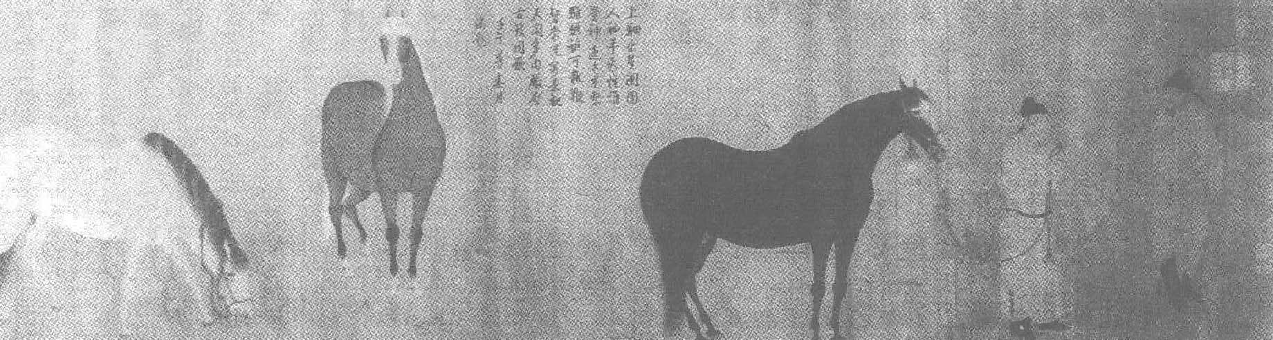 | 释义 | 任仁发出圉图卷元。任仁发(见《任仁发二马图卷》条目)绘。绢本设色。纵34.2厘米,横201.9厘米。北京故宫博物院藏。此图描绘三位圉人牵带四匹骏马出圉放牧的情形,但虚掉了一切背景,作者将全部笔墨都集中在人、马的形象上,图名只是示意而已。圉人戴乌帽,穿官袍,蹬皂靴,神情各异。马的毛色黑、白、棕、斑互不相同,或静立不动,或缓步前行,或引颈眺望,或垂首寻食,正侧俯仰,姿态不一。此图笔法细劲,线条流畅,色泽润朗。马匹形体优雅,肌腱毛骨都表现得准确自然,是一幅写实佳作。图左作者自题:“至元庚辰春望三月,作出圉图于可诗堂,月山任子明记。”下钤<任氏子明>、<月山道人>二印,可知此图作于至元六年,即公元1340年,任氏时年27岁。引首有陆勉篆书“出圉图”三字。曾经清内府收藏。《石渠宝笈续编》、《石渠随笔》著录。