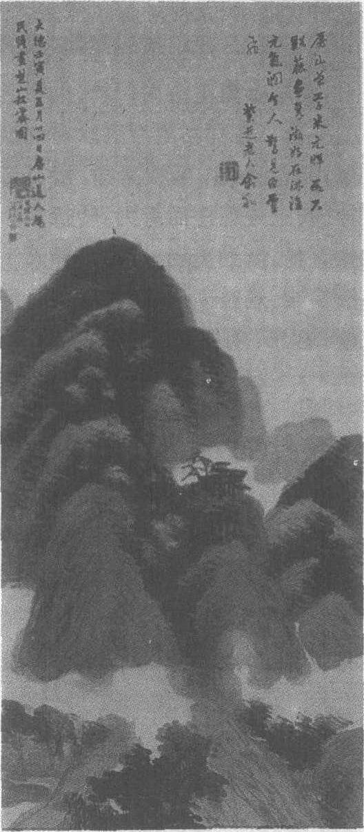 | 释义 | 任颐仿高克恭云山图轴清。任颐(见《任颐三友图轴》条目)绘。纵147.7厘米,横51.4厘米。上海博物馆藏。此幅绘近景山石之上杂木数株,林中屋舍隐现;小河蜿蜒流淌;山腰处云烟环绕,溪水奔泻。远处峰峦突起,郁苍莽莽,一派雨后初霁的山村景色。山石用长披麻皴,明快流畅,而峰峦则先用淡墨勾出轮廓,再以浓墨点皴,苍浑滋润,层次分明。树叶用深浅不同的墨点点簇而成,浓淡得宜。任颐多作花卉、人物,传世山水画不多见。此幅用浓墨横点画米家云山,而山石的造型与墨点的运用,又有胡公寿的风貌。画面上方摹元俞和、高克恭的题诗和钤印,自署:“光绪丙戌(公元1886年)八月浣,山阴任颐。”任颐时年47岁。