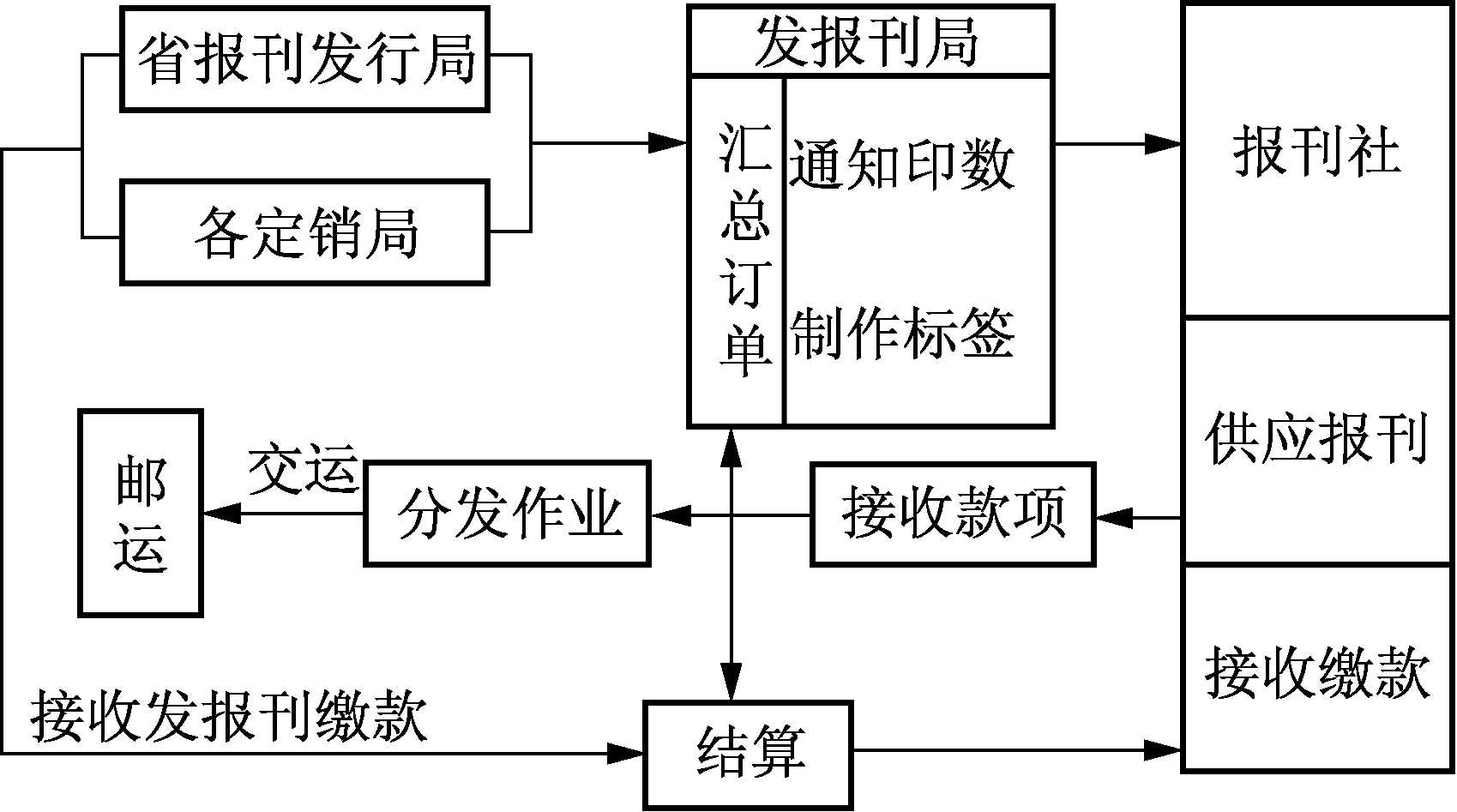 邮政企业对外地邮局订购本地出版发行的报刊处理的全过程。包括:汇总要数、制签、分发、结算等处理环节。