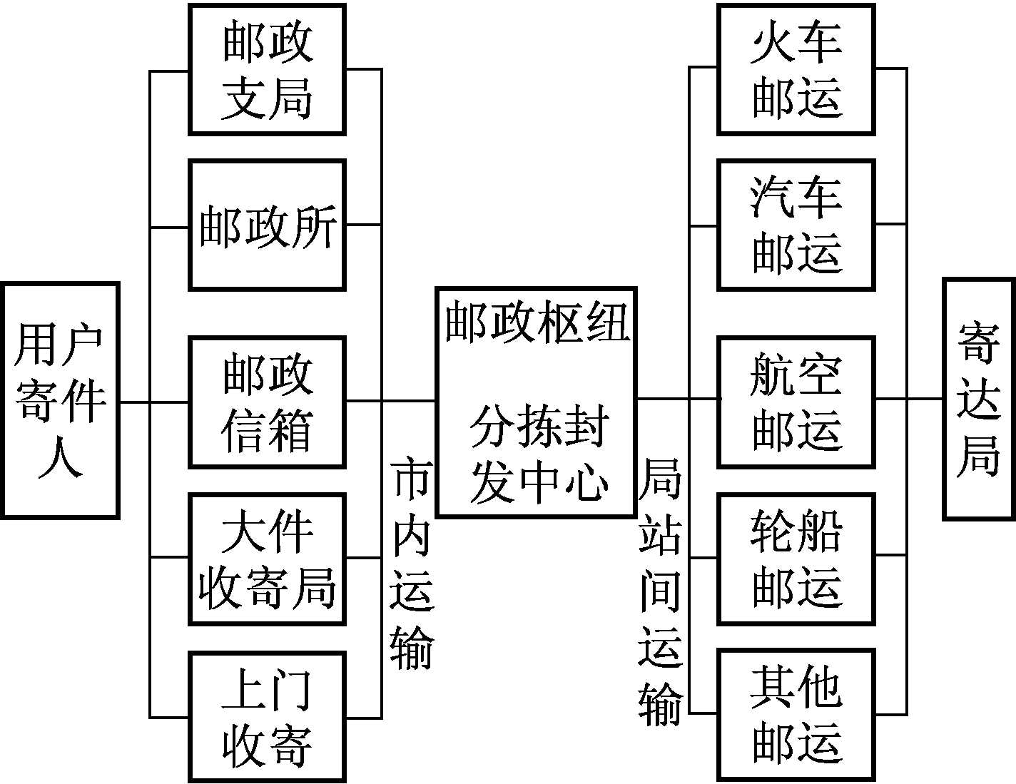 邮政企业对本局收寄发往他局投递或经转的邮件进行处理的全过程。包括:收寄过程、市内运输过程、分拣封发过程和转运处理过程。