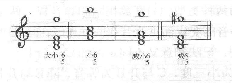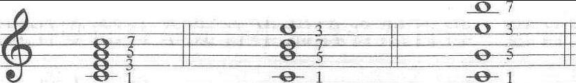 以七和弦的根音为低音的七和弦,称原位七和弦。以七和弦的三音五音或七音为低音的七和弦,称转位七和弦。以三音为低音是七和弦的第一转位,称五六和弦,用 “65”标记,其特征是三音与七音构成五度关系,三音与根音构成六度关系(原来根音与三音的三度关系的转位);以五音为低音是七和弦的第二转位,称三四和弦,用 “43”标记,其特征是五音与七音构成三度关系,五音与根音构成四度关系(原来根音与五音的五度关系的转位; 以七音为低音是七和弦的第三转位,称二和弦,用“2”标记,其特征是七音与三音构成二度关系(原来根音与七音的七度关系的转位)。 例: 七和弦的第一转位