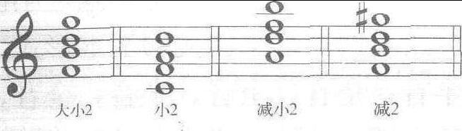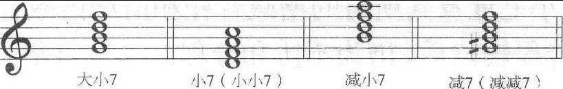 七和弦根据其音程结构的不同分为不同的七和弦,其名称的构成方式是三和弦性质加根音到七度音的音程性质,常用的七和弦有四种:(1)大小七和弦: 大三和弦加小七度音;(2)小小七和弦(简称小七和弦)小三和弦加小七度音;(3)减小七和弦(也称半减七和弦)减三和弦加小七度音;(4)减减七和弦(简称减七和弦)减三和弦加减七度音。 例: 四种七和弦