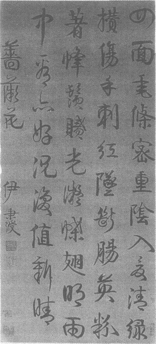 | 释义 | 伊秉绶行书蔷薇花诗清。纸本。纵109.9厘米,横49.9厘米。辽宁省博物馆藏。伊秉绶(见《伊秉授隶书临张迁碑轴》条目)行书蔷薇花诗云:“四面垂条密,重阴入夏清,绿攒伤手刺,红坠断肠英。粉著蜂须腻,光凝蝶翅明,雨中看亦好,况复值新晴。”后款署:“蔷薇花,伊秉绶。”款下钤白文:<臣伊秉绶>、朱文<默庵>两印。综观全书,书体凝练稳重,宽博舒展,时参入有横向的隶意和流走的篆意,于工稳齐整、端庄大方之中见洒脱委婉之笔致。用笔抑扬顿挫,方环转折,柔韧劲拔。线条粗细匀称,字体变化不大,结字古朴,无雕琢之意,不经意中法度自在,拙朴中透出灵秀之气。