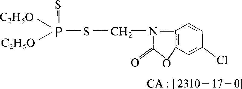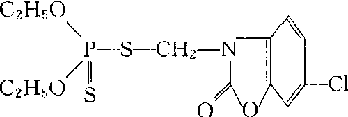 性能 纯品为无色结晶,微具蒜臭气味,熔点48℃。挥发性小。化学稳定性高,可与多种农药包括碱性药物混用。不溶于水,室温下水中溶解度为10毫克/升,可溶于多数有机溶剂,不溶于脂肪烃。对高等动物急性口服毒性中等,急性经皮毒性较低。大白鼠急性口服LD50135~170毫克/千克(雌),120毫克/千克(雄);兔急性经皮LD501530毫克/千克。无慢性毒性。一般使用情况下对蜜蜂低毒,对天敌昆虫影响较小。伏杀硫磷对害虫具有胃毒和触杀作用,有内渗作用,无内吸作用。 应用 伏杀硫磷主要以乳油或可湿性粉剂对水喷雾,用于果树、棉花、水稻、蔬菜、茶树等作物,防治蚜虫、叶螨、木虱、叶蝉、蓟马及鳞翅目、鞘翅目害虫。速效性好,残留量低。在植物上持效期为两星期,对叶螨的持效期较短。正常使用下无药害。 伏杀硫磷phosalone又称伏杀磷、Zolone、Rubitox。无内吸作用有机磷杀螨、杀虫剂。化学名称:O.O-二乙基-5-(6-氯苯并恶唑酮-3-基)甲基二硫代磷酸酯。化学结构式如下。工业纯品为无色晶体,略有蒜味,熔点45~47℃,溶解度25℃时水0.01 g/L、甲醇及乙醇200 g/L,丙酮、苯、氯仿、环己烷、甲苯、二甲苯1 000 g/L。急性口服毒性,小鼠LD50为180 mg/kg,大鼠为1 500 mg/kg,兔>1 000 mg/kg。两年饲喂试验无作用剂量大鼠250 mg/(kg ·d)、狗为290 mg /kg、对鱼毒性,鲤LC50为1.2 mg/kg(48 h)属中等毒性。在动物体内易分解。土壤中半衰期7天。苹果树用药10天后收获果实上残留低于2 mg/ kg。防治各种果树螨类、蚧、粉蚧、木虱,还可以防治棉叶螨、棉红铃虫、象甲类、蓟马、蚜虫类。