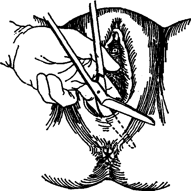 | 释义 | 会阴切开及缝合术会阴切开缝合术是产科最常用的手术。目的为避免会阴裂伤和克服阴道口对分娩的阻力。常用的方式为会阴侧切开(见图6.11-1),偶用会阴正中切开(发达国家愿用会阴正中切开)。方法为会阴见到胎头约2—3厘米或估计约3—4次宫缩胎儿将娩出时,于会阴局部麻醉后,当宫缩时,会阴切开剪刀(纯矢剪刀)自会阴后朕合中线向左侧45°方向切开会阴,一般切口约4—5厘米。阴道内手指起到引导剪开方向及保护胎儿先露部作用。胎儿娩出后缝合会阴。缝合方法不同则拆线期不同,如普通缝合即分粘膜层,肌层及皮下层及皮肤层3层分别缝合,5—6天拆线。“8”字缝合法即分粘膜层、皮下及皮肤两层分别缝合法,48小时即可拆线。皮下不留肠线,故术后伤口疼痛轻,长合较快。