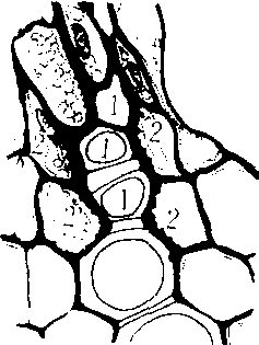 多花山柳菊根的部分横切面 1.原生木质部分子 2. 侧根基部的传递细胞 |