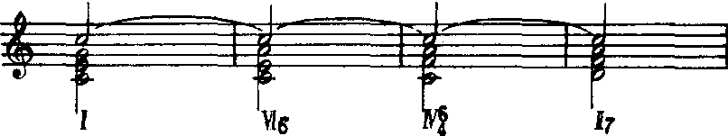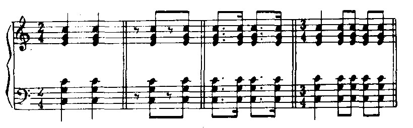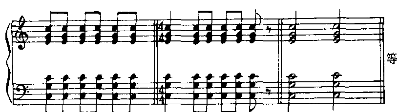 由此可见,和声的配置有多种可能性,要根据对歌(乐)曲的分析而选用,才能使音乐形象表现得更加深刻鲜明。 ❸音型的选择。音型是和声进行的节奏与旋律化,把和弦音按照特定的方式有规律地组织起来,使之成为比较固定的节奏形态。根据常见的各种不同性质的歌(乐)曲伴奏,音型可分为3类:❶和弦柱式音型。是把和弦音以1拍或半拍作为1个音型单位,同时奏出的伴奏音型。这种音型具有节奏鲜明、雄壮有力的特点。如: