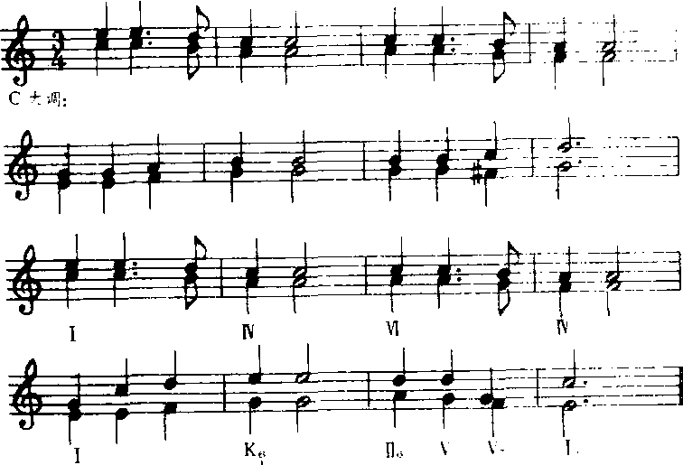 又如歌曲《天上的太阳,你早》一歌结尾是这样:Ⅱ可代替Ⅳ也是下属到主的变格终止。