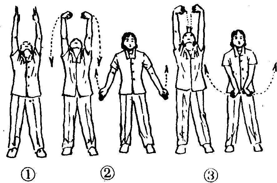 练功十八法第5套第3节。动作过程:两脚分立,略宽于肩,两手握拳收于腰间。❶两拳变掌屈臂上举,掌心相对,抬头看天。(图2—4—146—❶)❷两手握拳,两臂经体侧下落成预备姿势。(图2—4—146—❷)做1~2个8拍❸两拳变掌,两臂向下伸,掌心向外,翻腕再经体侧上举。(图2—4—146—❸)❹两掌变拳屈腕,使拳背相对,屈臂,经体前下落并还原成预备姿势。共做2个8拍。注意事项:两手上举时要抬头挺胸,练功次数也可以根据需要来定。此功对漏肩疯、网球肘、腕指腱鞘炎具有一定的治疗效果。