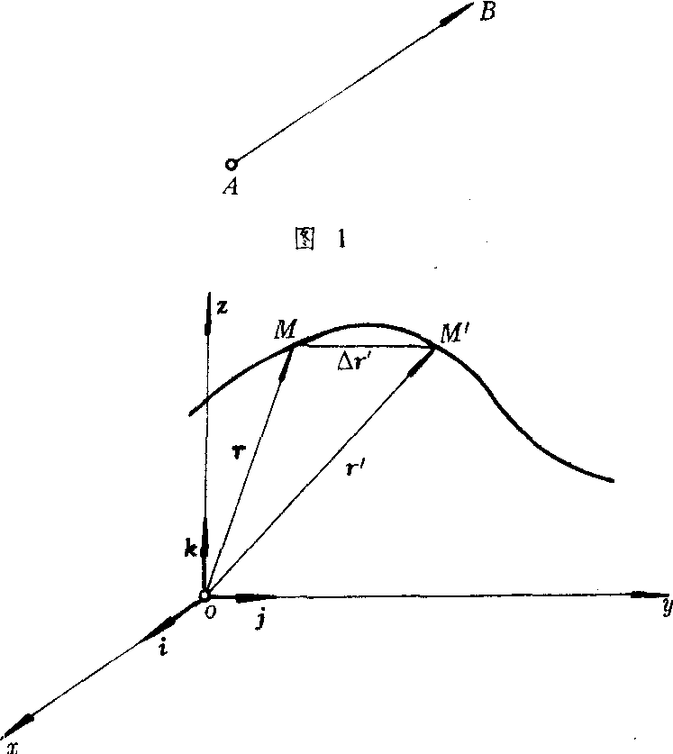 图 2 图2中,点P在t时刻位置为M,在t′时刻位置为M′,相应的位置矢量为r和r′,则矢量△r即为位移。它描述了在时间间隔△t=t′-t中点P的位置变化。根据定义,位移矢量应等于△r=r′-r,也可用△r在ox、oy、oz轴上三个分量△x、△y、△z来表示位移。式中i、j、k分别是沿ox、oy、oz轴方向的单位矢量。即:△r=△xi+△yj+△zk。位移和路程不同。路程是指在一定时间内质点所经轨迹的总长度,是恒正的标量。如图所示,点P在△t时间间隔内由M点沿轨迹曲线运动到M′点,所经过的路程是曲线长MM′(标量),与位移△r不同。位移与路程是两个不同的概念,但当时间间隔△t很小时,位移的大小与路程的差值很小;当△t→0,则两者相等。若质点沿一个方向作直线运动,在一定时间间隔内,位移大小和路程相等。 位移描述空间质点位置变化的物理量。质点在某一时间内的位移,用它在这段时间内的初位置指向末位置的带有箭头的直线段表示。位移为矢量,它的SI单位是米。 位移描述质点位置变化的物理量。它是矢量,用初位置到末位置的有向线段表示。参见“物理”中的“位移”。 |