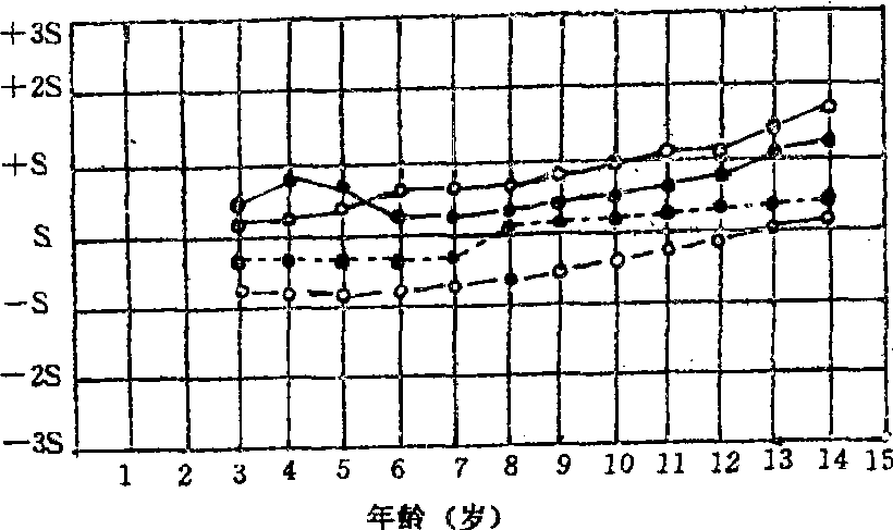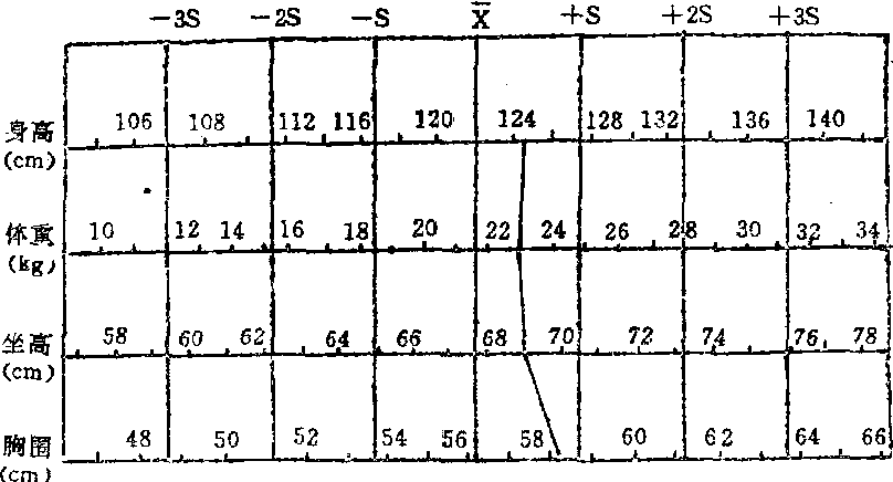 图1 某地女性7岁体型图 例如: 某7岁女童其个体发育资料与标准比较