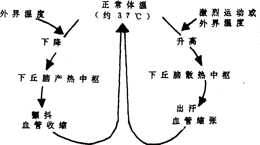 图493 体温调节示意图 体温调节tiwen tiaojie通过神经、体液的调节作用而保持恒定体温的过程。人体为了维持相对稳定的新陈代谢,需要有一个恒定的温度条件。体内的物质代谢,必须在37℃左右的温度下才能正常进行。若体温低于正常,代谢速率就会减慢。若体温过高,酶的功能就会紊乱,中枢神经系统的功能也会失去正常。因此,必需维持恒定的体温。体温调节中枢位于下丘脑。在低温环境中,人体感受冷的刺激,在体温调节中枢的调节下,骨骼肌的紧张性增强甚至发生寒战以增加产热量。此外,下丘脑通过神经体液途径促进某些内分泌腺的活动,以促进细胞的代谢而增加产热量。当环境温度升高,通过体温调节中枢的调节,使皮肤血管舒张,增加皮肤的血流量以增加皮肤的辐射、传导和对流散热,并通过使支配汗腺的交感神经兴奋,促进汗液分泌以增加蒸发散热。 体温调节人和恒温动物保持体温相对稳定的各种行为和生理活动的总称。一些活动产生热,如肌肉运动及进食等;一些活动散发热,如出汗等。身体能调节产热和散热间的平衡,以适应冷热不同的环境,保持体温的相对稳定。 体温调节themoregulation恒温动物通过产热和散热过程的动态平衡维持体温相对稳定的各种机制。调节方式可分为生理性体温调节和行为性体温调节两种。变温动物只能通过行为性的调节机制,如寻求适宜的温度环境或改变姿势等,使体温在一个小范围内随环境温度而变化。恒温动物除行为性调节机制外,还具有生理性体温调节机制,即在中枢神经系统(特别是下丘脑)的控制下,通过骨骼肌、内分泌腺的活动、皮肤血管的收缩及汗腺活动调节机体的产热、散热过程,以维持体温的恒定。如寒冷刺激可反射性的引起皮肤血管收缩(减少散热),骨骼肌紧张性加强,甚至出现寒颤,同时引起肾上腺素、甲状腺素的释放(增加产热),以维持体温的恒定(见“体温调节中枢”)。 |