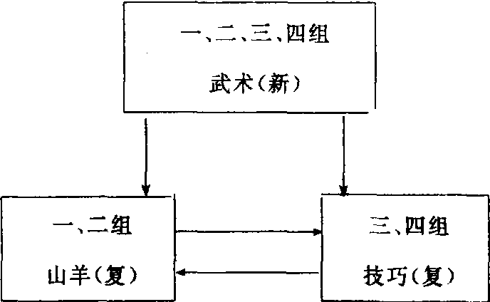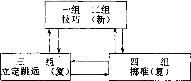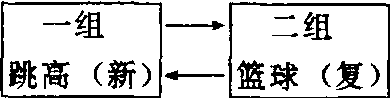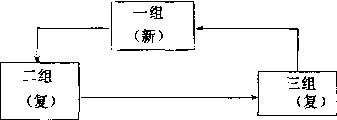 ❷三组两次等时轮换。即把学生分成三组,分别学习和复习三种不同教材,到基本部分三分之一时,三组依次轮换一次,到三分之二时间, 三组再轮换一次, 如图。 ❸四组三次