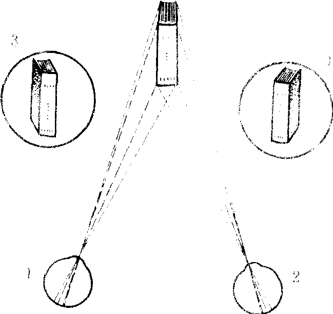 1—左眼; 2—右眼; 3—左像; 4—右像 模拟双眼体视效应的一种照相技术称为立体照相或体视照相。这是体视原理的一个重要应用。对于同 一静止的景物,可先后在两个相当于两眼的位置去拍照,得到同一景物的两幅稍有差别的照片(称为相片对)。然后,人眼可通过各种专用工具(如用滤色镜或偏振片制成的立体眼镜、航空测量中用的体视镜等)来观察这种相片对,也能在两眼的视网膜上 形成稍有差别的像,因而产生立体视觉。产生立体视觉除上述方法外,还有柱面立体摄影法和全息照相法等。体视原理已应用于立体电影、电视工业和航空摄影测量等许多方面。例如,有些地图册印有红绿两色相叠的地形图,观者可戴上用滤色镜制成的立体眼镜,使 一只眼通过红色滤色镜看到红色图,另一只眼通过绿色滤色镜看到绿色图。于是观者产生了一定的立体感,山峦起伏跃然出现。 |