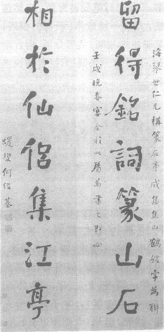 | 释义 | 何绍基行书七言联清。纸本。纵136.8厘米,横30.5厘米。四川省博物馆藏。何绍基(清嘉庆四年—同治十二年,即公元1799—1873年),字子贞,号东州、蝯叟,道州(今湖南道县)人。道光十六年进士,历官编修,充武英殿国史馆协修、总纂,国史馆提调,历典福建、贵州、广东乡试,四川学政,晚年在湖南讲学,主持扬州书局,校定《十三经注疏》,病逝于苏州。博览群书,于六经、子史,皆有著述。工书,早年书法多为楷书,中年多为行草、篆隶,书作为世人所珍宝。清蒋宝龄《息柯杂著》云:“贞老书专从颜清臣问津,积数十年功力,探源篆隶,入神化境。晚年尤自课勤甚。”清杨守敬《学书迩言》云:“子贞以颜平原为宗,其行书如天花乱坠,不可捉摸。篆书纯以神行之,不以分布为工。隶书学《张迁》,几逾百本,论者知子贞之书,纯以天分为事,不知其勤笔有如此也。然学之而不免于轻佻者,以胸襟自劣于子贞也。”著有《说文段注驳正》、《东州草堂诗集》、《东州草堂金石跋》、《文抄》等。《清史稿》卷四百八十六有传。此七言联“留得铭词篆山石,相于仙侣集江亭。”款署:“海琴世仁兄构篆石亭成集焦山鹤铭字为联,壬戌晚春宴余于此属为书之即正,蝯叟何绍基。”款下钤朱文<何绍基印>白文<子贞>两印。此书将篆隶融会于行书之中,字体以纵取势,方圆交错,体势遒劲,有一种骨劲内在的美感。