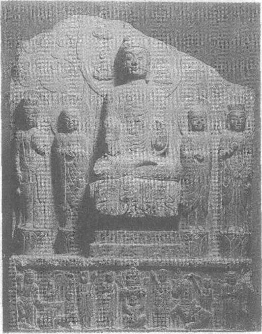 | 释义 | 佛五尊造像碑隋。残高62.6厘米。上海博物馆藏。主尊头刻波浪形发髻,袒胸束条帛,外着通肩衲衣,右手作与愿印,结跏趺坐于高台座上。头光内左右各饰一小坐佛。两旁有双手抚捻珠、立于莲座上的弟子和执莲蕾的菩萨各一。四尊有饰满火焰纹的头光。佛、弟子、菩萨皆面容丰腴,大耳垂肩,闭目沉思,面含笑意。其下方龛内中间刻一力士,蹲托一盘,盘上盛莲花等物。左右为供养人、跃马,牛车及力士。