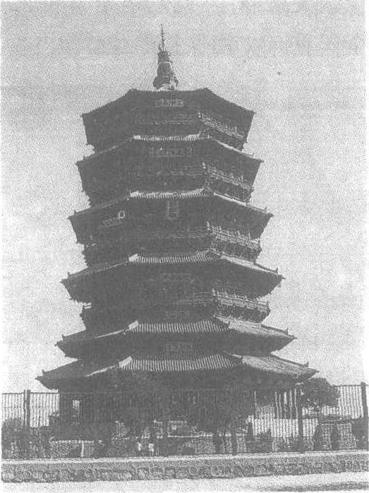 | 释义 | 佛宫寺释迦塔辽清宁二年(公元1056年)。在山西省应县城佛宫寺内,俗称应县木塔。塔高67.13米,底径30米,建在4米高的两层石砌台基上,平面呈八角形,外观五层,底层为重檐,夹有四级暗层,实为九层。各层屋檐上皆设平座勾栏。塔的结构柱网采用内外两横立柱,柱顶上均用多层枋连接,内外槽之间也有梁枋连接,形成紧密结合的双层套筒式结构。内槽供佛,外槽则是朝拜礼佛的通廊。暗层中以斜撑的手法来加强木塔的整体性,每层外柱比下层外柱退入约半个柱径,不仅增加了塔的稳定,也构成了塔身的优美曲线。木塔的九层结构,每层都以斗拱联接,各层檐下的几十种斗拱如云朵簇拥,它与许许多多的柱、梁、枋和斜撑共同起作用,构成回廊式结构。由于其构造和使用功能设计合理,木塔虽已经受了900年风风雨雨的考验,其间曾发生过连续七日的大地震,也曾遭受炮火的袭击,但却巍然屹立于雁北的平原大地上。这座我国现存最古最高的木构大塔,集建筑、功能、造型技术为一体,在中外建筑史上都占有重要的一席。