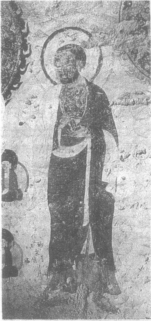 | 释义 | 佛弟子像壁画中晚唐。甘肃省永靖县炳灵寺石窟第11窟正壁南侧壁画。弟子身披红色袈裟,脚蹬麻鞋,手持法器,脸部有络腮胡须,双目低垂,神态虔诚。从其形态看,是一位历尽沧桑的男子,稳重而深沉,颇有特性。作者的绘画技艺高超,人物的形象及精神面貌均在笔下反映出来。落笔雄劲,所绘衣衫自然贴切,赋彩十分厚重,是一幅成功的肖像作品。