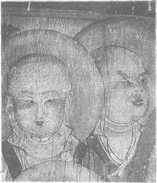 佛弟子像壁画西夏。甘肃省肃南裕固族自治县文殊山石窟万佛洞中心柱西侧壁画。画面上有两名佛弟子。右侧一位为青年形象,面庞丰满,剑眉微耸,凝视前方,张口欲语,似要发表高见。右侧的弟子更为年轻,为一英俊少年,面庞圆润,双耳大而柔软,柔嫩的肌肤质感很强,双目微下视,朱唇紧闭,表情与其孩童般的圆脸不太相符,令人见而生爱。两位弟子形象生动、自然,人物采用铁线描,墨线较粗,轮廓清晰,脸部及颈部皆施以晕染,使人物层次更为丰富。