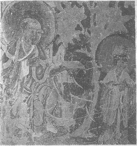 | 释义 | 佛弟子及供养人像壁画五代。甘肃省肃北蒙古族自治县五个庙石窟第1窟南壁壁画。图中弟子内着交领衫,外披红色袈裟,为结跏趺坐,左手持器,意在请求施与。其左侧为一女供养人,戴冠,着宽袖对襟长袍,双手合十,虔诚而立。画风粗犷、豪迈,人物线条勾勒娴熟,脸及服饰局部有晕染,立体效果增强。此图显然是将佛弟子作为本尊供养,这种现象在佛教壁画中是不多见的。
