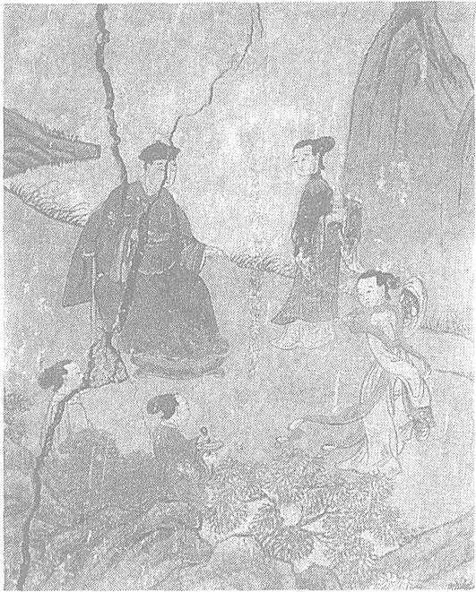 | 释义 | 佛本行经变图(园林嬉戏)壁画明。纵85厘米,横67厘米。山西省平遥县镇国寺三佛楼东壁壁画。图中太子端坐椅上,穿红袍,系玉带,举手指点。周围有舞伎、杂耍者、乐伎四人。舞伎正在表演,姿态轻盈,飘带随风飞扬;乐伎双手持笙;杂耍者手持转盘。周围衬以坡石、苍松、野草。这些景物线条随意,染色活泼,具有水墨画的效果。