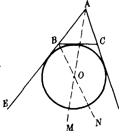 已知△ABC.求作△ABC的旁切圆.作法 ❶作∠A的平分线AM(如图);❷作∠ABC的外角∠CBE的平分线BN,AM,BN交于O;❸以O为圆心,O到BC的距离为半径作圆.则⊙O就是所求的△ABC的一个旁切圆.