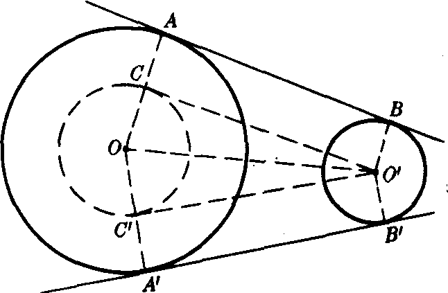 作法 ❶以O为圆心,R-R′为半径作圆; ❷过O′作这个圆的切线O′C,切点为C; ❸连结OC,并延长OC交⊙O于A; ❹过O′作O′B∥OA,交⊙O′于B; ❺过A,B两点作直线.则直线AB就是所求的切线. 用同样的方法,可以作出另一条外公切线A′B′. 说明 ❶当R=R′时,作与它们的连心线距离为R的直线,就可得到两圆的外公切线; ❷当两圆内切时,经过切点作直线垂直于它们的连心线,就可得到它们的外公切线; ❸当两圆外离、外切或相交时,均可作出两条外公切线;当两圆内切时,可作出一条外公切线;当两圆内含时,无外公切线. |