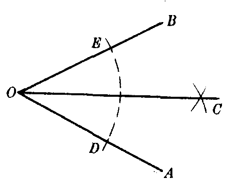 已知 ∠AOB(如图).求作 射线OC,使 ∠AOC=∠BOC. 作法 ❶以O为圆心,任意长为半径作弧,和OA,OB分别交于D,E; ❷分别以D,E为圆心,大于DE/2的同样的长为半径作两条弧,在∠AOB内部,相交于点C; ❸作射线OC.则OC就是所求的角平分线. |