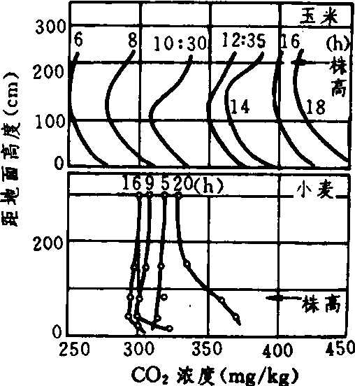 | 释义 | 作物地二氧化碳carbon dioxide in crop fields作物地微气候要素之一。作物地CO2主要来自大气和土壤,且通过乱流交换作用输送到作物地。输送量的多少决定于乱流强弱以及作物层与大气上层之间CO2浓度的差值。农作物的光合作用和呼吸作用,使作物地中CO2浓度,具有明显日变化:昼间作物地中CO2浓度比较低,大气是CO2的“源”,作物地是CO2的“汇”(即“库”);夜间则相反,作物地CO2浓度较高,是CO2的“源”,大气则是“汇”。这样的“源”与“汇”日变化,使得作物地中CO2浓度的铅直廓线,具有某些特殊性:昼间因作物吸收CO2,使CO2浓度廓线最低值在作物层某一高度上出现,并由此向上、向下递增,称为同化型分布;而夜间由于作物的呼吸作用释放CO2,其CO2浓度的铅直廓线,由地面向上递减,称为呼吸型分布。此外,对水平叶较多的作物,上述变化不明显。天气条件和作物生长状况,对作物地CO2浓度变化也有很大影响。阴天或大风时,可使CO2浓度的日变幅减小;反之,晴天或小风时,日变幅增大。