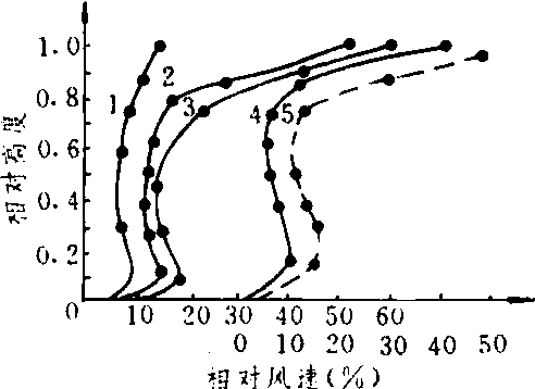 各种作物地中相对风速的垂直分布 1. 谷子(高1.1 m) 2.小麦(高0.9 m ) 3. 玉米(高2.7 m) 4. 水稻(高0.95 m) 5.水稻相对脉动风速 |